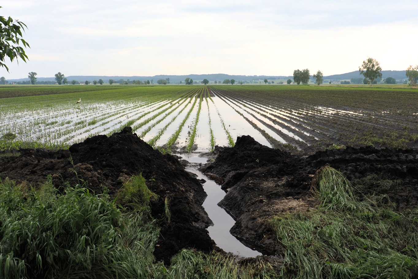 „Wir stehen vor der Endlichkeit der Bewirtschaftung entwässerter Moorflächen“, sagte Prof. Dr. Drösler vom Peatland Science Centre der Hochschule Weihenstephan-Triesdorf gleich zu Beginn. Sein Beispiel war eindrücklich: Ein Messpfahl im Donaumoos zeigt, dass der Boden seit 1836 um über drei Meter abgesackt ist. Trockengelegte Moorflächen verlieren jährlich zwischen 0,5 und 2 cm Bodensubstanz, dadurch, dass sich der organische Torf an der Luft zersetzt – mit schwerwiegenden Folgen für Bodenstruktur, Wasserhaushalt und Klima. Die Böden reißen auf, verwehen und haben bei Starkregen nicht mehr die ursprüngliche Wasseraufnahme- und Haltefähigkeit (Abbildung 1). In spätestens 30 Jahren, so Herr Drösler, sei bei ca. 40% der Moorflächen die Grenze der entwässerungsbasierten Bewirtschaftbarkeit erreicht.